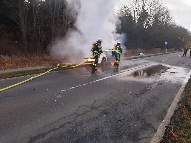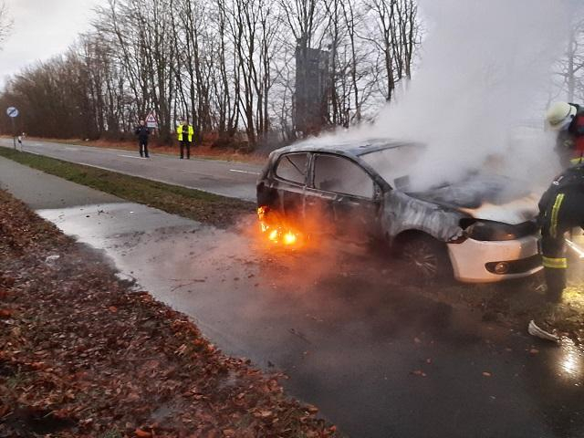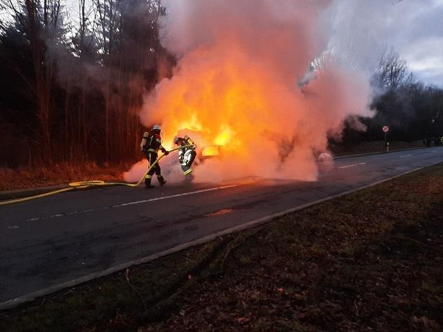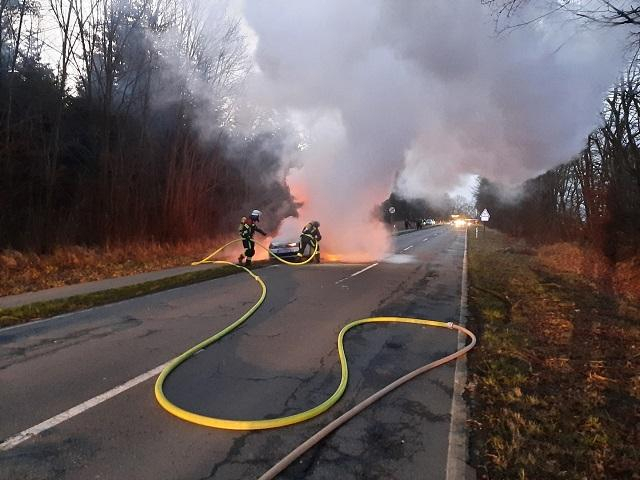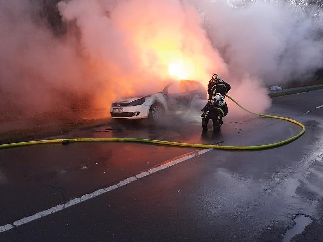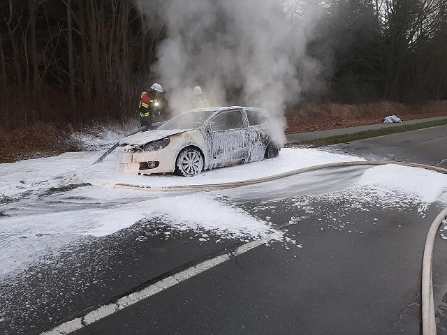 Beim Eintreffen der Feuerwehr, brannte der PKW in voller Ausdehnung, der PKW wurde unter Atemschutz mit Wasser abgelöscht. Da der Kraftstoff aber immer wieder durchzündete, wurde dieser mit Schaum abgelöscht.